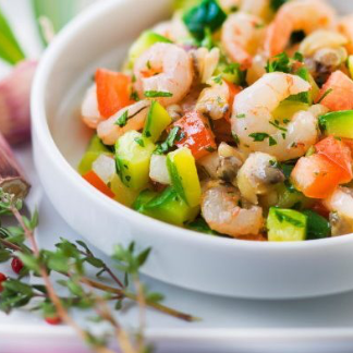 Lasciar decongelare le mazzancolle in frigorifero per qualche ora o sotto un getto d’acqua fredda; far decongelare anche le vongole in frigorifero. Far scaldare due cucchiai di olio extravergine di oliva in una padella antiaderente, versare la quantità desiderata di verdurine e cuocere per 6-8 minuti a fuoco vivo mescolando regolarmente. Aggiungere le mazzancolle e le vongole, far cuocere per qualche minuto a fuoco vivo e salare quanto basta. Lasciar raffreddare e spolverare con del prezzemolo tritato. Il piatto può essere servito anche freddo a seconda dei propri gusti.